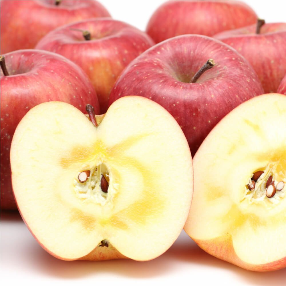 実に袋をかけずに栽培される山形のふじは、太陽の光をふんだんに 受けて育ちます。果肉の中には、完熟の証であるアメ色の蜜がたっ ぷり! さわやかな酸味と甘味のバランスが絶妙です。 その中でも朝日町ブランドの中の最高クラスとされる天狗印ブランドは甘味・酸味・歯ごたえともにナンバー1